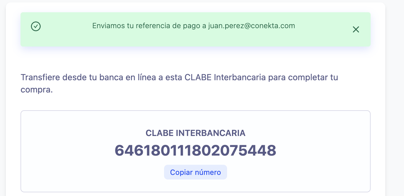 }'Cuando el cliente acceda al Checkout y seleccione transferencia, se generará una CLABE única diferente (por ejemplo