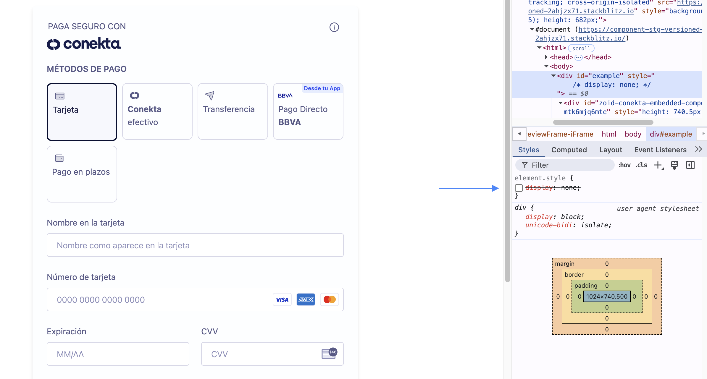 Esto se debe a que el elemento que contienen al modal está aplicando una clase con "display: none", lo que oculta el componente de pago. Es crucial revisar la implementación para eliminar este estilo o, alternativamente, utilizar un contenedor que no lo aplique.